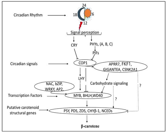 Carotenoids are indisputably one of the vital plant pigments that contribute to human nutrition and health by providing dietary provitamin A. Vitamin A improves vision and provides an antioxidant effect against cardiovascular and cancer disorders [,]. Previous studies have described carotenoid biosynthesis and regulation as well as its stimulation by environmental factors such as light, temperature, drought, salt stress, hormones, photoperiods, developmental cues, and post-transcriptional feedback regulations in plants [,,]. Plants have developed mechanisms to perceive light signals, such as light intensity, variable wavelengths, direction, and the circadian clock. The effect of photomorphogenic genes on carotenoid biosynthesis involves complex interactions [,]. In a nutshell, a circadian rhythm consists of interlocking transcription or translation loops that regulate photomorphogenic genes comprising phytochromes (PHY) and phytochrome-interacting factors (PIF), cryptochromes (CRY), phototropin, and UVR8 signals. Plant photoreceptors receive circadian signals during plant etiolation and subsequently construct a passage of intracellular second messenger processes by inducing signals to control carotenoid biosynthesis [].