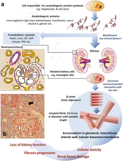 Common mechanisms of renal amyloidosis. (a) Schematic representation of process of renal amyloidosis formation. GIT—gastrointestinal tract; PNS—peripheral nervous system; scheme of renal parenchyma: 1—glomerulus; 2—mesangium; 3—arterioles; 4—arterial wall; 5—tubules; 6—glomerular basement membrane; 7—interstitium. (b) The microphotograph demonstrating amyloid deposition in mesangium, capillary basement membranes and arterioles of glomerulus (white arrow), interstitium (black arrow) and arterial wall (arrowhead) presented as homogenous Congo-positive masses. Congo red stain, original magnification ×200 (the microphotograph was obtained by V.G. Sipovsky.