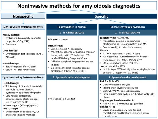 Noninvasive methods for amyloidosis diagnostics. AA—serum amyloid A amyloidosis; AFib—fibrinogen α chain amyloidosis; AH—immunoglobulin heavy chains amyloidosis; AHL—immunoglobulin heavy and light chains amyloidosis; AL—immunoglobulin light chains amyloidosis; ALP—alkaline phosphatase; ALT—alanine aminotransferase; AST—aspartate aminotransferase; ATTRv—hereditary type of transthyretin amyloidosis; CT—computed tomography; ECG—electrocardiography; I/T—troponin I/troponin T; LV, left ventricle; MG—monoclonal gammopathy; MS—mass spectrometry; NT-proBNP—N-terminal pro-B-type natriuretic peptide [,].