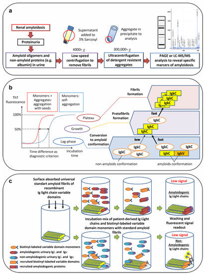 Perspective approaches for noninvasive diagnostics of amyloidoses. (a) Methods based on the amyloid resistance to detergents. (b) Seeding of amyloidogenic protein monomers by preexisting aggregates. (c) Recruitment of amyloidogenic monomer proteins by synthetic amyloid fibrils. PAGE—polyacrylamide gel electrophoresis; LC-MS/MS—liquid chromatography with tandem mass spectrometry; ThT—thioflavin; IgκC—Igκ constant domain; IgκV—Igκ variable domain.