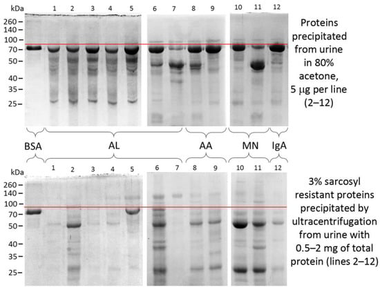 Proteins of urine and detergent-resistant aggregates from patients with proteinuria. Samples are separated in polyacrylamide gel electrophoresis and stained by Coomassie Brilliant Blue. BSA—bovine serum albumin, AL—AL amyloidosis, AA—AA amyloidosis, MN—membranous nephropathy, IgA—immunoglobulin A nephropathy. Spectra Multicolor Broad Range Protein Ladder (no. 26634) (Thermo Fisher Scientific, Waltham, MA, USA) is shown to the left of the gels. Red line indicates the area just above the BSA band (2 µg) that runs at the level of human serum albumin in the samples on the right (lines 1–12). Images was obtained by S.A. Fedotov.
