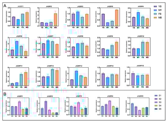 2.10. Expression Analysis of JrGRF Gene in Different Tissues and Different Stages of Female Flower Bud Differentiation