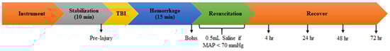 - Mayer, A.R.; Dodd, A.B.; Vermillion, M.S.; Stephenson, D.D.; Chaudry, I.H.; Bragin, D.E.; Gigliotti, A.P.; Dodd, R.J.; Wasserott, B.C.; Shukla, P.; et al. A systematic review of large animal models of combined traumatic brain injury and hemorrhagic shock. Neurosci. Biobehav. Rev. 2019, 104, 160–177. [Google Scholar] [CrossRef] [PubMed]