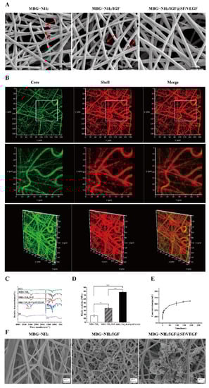 SEM was used to determine the morphology and microstructure of the MBG-NH2, MBG-NH2/IGF and MBG-NH2/IGF@SF/VEGF scaffolds. It was shown that all these scaffolds contained fibers of uniform size and nanometer diameter. The fibers were stacked to form a three-dimensional network with a high porosity that could benefit cell adhesion and growth. The surfaces of the MBG-NH2 and MBG-NH2/IGF scaffolds were rough, and there were small parts of raised MBG particles. In particular, the MBG-NH2/IGF@SF/VEGF scaffolds had a relatively smooth surface (Figure 1A) because they had an outer shell of SF covering the bioactive glass inside.