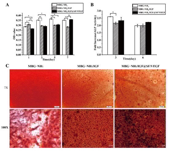 In order to study the effect of the scaffolds on BMSCs, we evaluated the proliferation, differentiation and mineralization in BMSCs cultured on these scaffolds. Firstly, we evaluated cell proliferation by cell activity. It was shown that the cell activity of the BMSCs cultured on the MBG-NH2/IGF@SF/VEGF scaffolds rapidly increased within 7 days (Figure 2A; compare the black columns with the twill shading column and the white column), indicating that the MBG-NH2/IGF@SF/VEGF scaffolds had a good effect on promoting proliferation. Since ALP activity increases during early osteoblast differentiation [], ALP activity can be used to evaluate cell differentiation. In the process of osteoblast differentiation, the ALP activity of the BMSCs cultured on these scaffolds reached a high level on day 3 and then decreased (Figure 2B). Additionally, the ALP activities of the BMSCs cultured on the MBG-NH2/IGF@SF/VEGF scaffolds on day 6 were higher than those of the other two scaffolds (Figure 2B; compare the black columns with the twill shading column and the white column), indicating that the MBG-NH2/IGF@SF/VEGF scaffolds were better at promoting osteoblast differentiation. The amount and area of alizarin red-stained mineralized nodules demonstrated the degree of mineralization of the BMSCs cultured on these scaffolds. The results showed that compared with those on the MBG-NH2 scaffolds, the BMSCs cultured on the other two scaffolds had larger mineralized nodules; the mineralized nodules of the BMSCs cultured on the MBG-NH2/IGF@SF/VEGF scaffolds were also of a higher amount and were more densely packed (Figure 2C), which indicated that both the MBG-NH2 scaffolds combined with IGF-1 and the coaxial structure fiber scaffolds combined with IGF-1 and VEGF had a better ability to promote the mineralization of the BMSCs and that the performance of the MBG-NH2/IGF@SF/VEGF scaffolds was better than that of the MBG-NH2/IGF scaffolds.