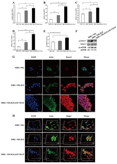 Osteogenic effect of BMSCs cultured on MBG-NH2, MBG-NH2/IGF and MBG-NH2/IGF@SF/VEGF scaffolds in vitro. (A–D) Osteogenic mRNA expression levels of BMSCs cultured on the scaffolds for 7 days: Bmp2 (A), Opn (B), Osterix (C), and Runx2 (D). (E) Runx2 activity of BMSCs transfected with Runx2-binding element-Luc and cultured on the scaffolds for 3 days. Runx2 activity was defined by relative luciferase activity, with renilla luciferase plasmid pRL-SV40 as internal control. (F) Osteogenic protein expression levels of BMSCs cultured on the scaffolds for 7 days according to Western blot. Total Erk1/2 and mTOR were used as loading control for p-Erk1/2 and p-mTOR, respectively. (G–H) Osteogenic protein expression levels of BMSCs cultured on the scaffolds for 7 days according to immunofluorescence. Actin was used as a loading control for Runx2 (G) and Bmp2 (H), stained with FITC. Runx2 and Bmp2 (red) were stained with Alexa Fluor 594, and the nuclei (blue) were stained with DAPI. Scale bars: 50 μm. Experimental data were analyzed as indicated and reported as mean ± SE. (* p < 0.05; ** p < 0.01; *** p < 0.001).