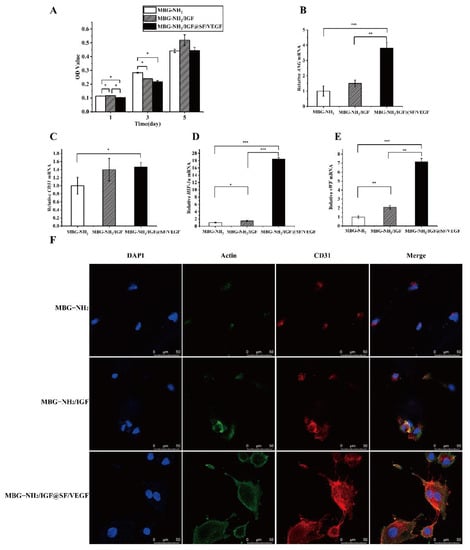 Angiogenic effect of HUVECs cultured on MBG-NH2, MBG-NH2/IGF, and MBG-NH2/IGF@SF/VEGF scaffolds in vitro. (A) Proliferation of HUVECs cultured on the scaffolds for 1, 3 and 5 days. (B–E) Angiogenic mRNA levels of HUVECs cultured on the scaffolds for 7 days. ANG (B), CD31 (C), HIF-1α (D) and vWF (E). (F) CD31 expression level of HUVECs cultured on the scaffolds for 7 days according to immunofluorescence, with Actin as a loading control, stained with FITC. CD31 was stained with Alexa Fluor 594, and nuclei (blue) were stained with DAPI. Scale bars: 50 μm. Experimental data were analyzed as indicated and reported as mean ± SE. (* p < 0.05; ** p < 0.01; *** p < 0.001).