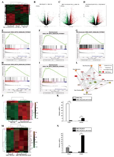 RNA-seq analysis of angiogenic effect on osteogenesis. Total RNA was extracted from BMSCs co-cultured with HUVECs on MBG-NH2, MBG-NH2/IGF and MBG-NH2/IGF@SF/VEGF scaffolds. (A) General heatmap of all the differentially expressed genes. (B–D) Volcano plots of all the differentially expressed genes between MBG-NH2/IGF and MBG-NH2 scaffolds (B), MBG-NH2/IGF@SF/VEGF and MBG-NH2 scaffolds (C), and MBG-NH2/IGF@SF/VEGF and MBG-NH2/IGF scaffolds (D). Increased expression genes are indicated by red dots, while decreased expression genes are indicated by green dots. (E–I) Enrichment plots of GSEA analysis showing the KEGG Notch signaling pathway between MBG-NH2/IGF@SF/VEGF and MBG-NH2 (E), the KEEG TGF-β signaling pathway between MBG-NH2/IGF@SF/VEGF and MBG-NH2 (F), the KEEG MAPK signaling pathway between MBG-NH2/IGF@SF/VEGF and MBG-NH2/IGF (G), the KEEG Notch signaling pathway between MBG-NH2/IGF@SF/VEGF and MBG-NH2/IGF (H), and the KEEG TGF-β signaling pathway between MBG-NH2/IGF@SF/VEGF and MBG-NH2/IGF (I). (J) Partial heatmap of the differentially expressed genes associated with bone development, bone mineralization, bone morphogenesis and bone remodeling in MBG-NH2/IGF@SF/VEGF and MBG-NH2. (K) mRNA levels of Csf1r and Grem1. (L) Interaction networks and functional enrichment analysis of the differentially expressed genes associated with bone development, bone mineralization, bone morphogenesis and bone remodeling between MBG-NH2/IGF@SF/VEGF and MBG-NH2 in (J). (M) Partial heatmap of the differentially expressed genes associated with bone development, bone mineralization, bone morphogenesis and bone remodeling between MBG-NH2/IGF@SF/VEGF and MBG-NH2/IGF. (N) mRNA levels of Cthrc1 and Cited2. Experimental data were analyzed as indicated and reported as mean ±SE. (**** p < 0.0001).