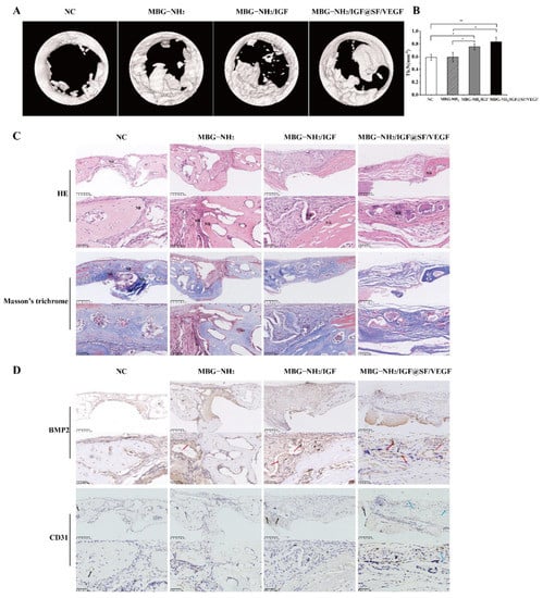 In order to further study the effect of the MBG-NH2/IGF@SF/VEGF scaffolds on angiogenesis and the effect of vascularization on osteogenesis in the bone defect repair model, Bmp2 and CD31 were stained in tissues. The results showed that Bmp2 was expressed in the bone defects filled with three scaffolds, and the amount of Bmp2 was highest in the MBG-NH2/IGF@SF/VEGF scaffold group. CD31 serves as a marker of angiogenesis. We found that there were more haversian canals in the bone defect grafted with the MBG-NH2/IGF@SF/VEGF scaffolds, as well as obvious CD31 expression (Figure 6D). In conclusion, the MBG-NH2/IGF@SF/VEGF scaffolds demonstrate good bone induction ability in bone defect repair and promote bone angiogenesis in the early stage of bone healing, thus providing a suitable microenvironment for subsequent osteogenesis.