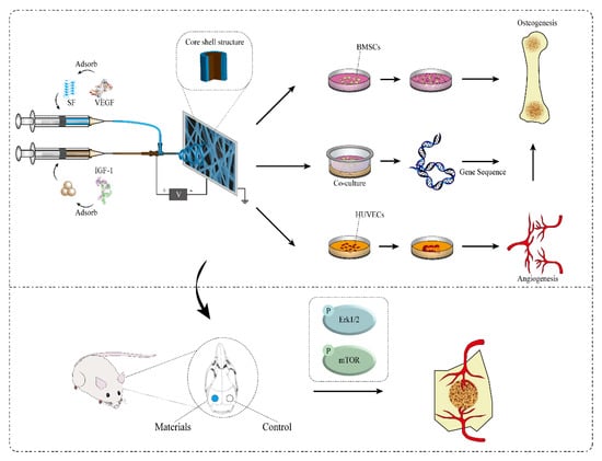 To sum up, in this study, biological scaffolds were prepared with the electrospinning method, in which MBG-NH2 adsorbed with IGF-1 was used as the core and SF adsorbed with VEGF was used as the shell. The biological scaffolds were used for the culture of bone marrow mesenchymal stem cells (BMSCs) and human umbilical vein endothelial cells (HUVECs) to verify their osteogenic and angiogenic effects, respectively, and the promoting effect of angiogenesis on osteogenesis was explored by sequencing after the co-culture of these two cells. Furthermore, we also evaluated the in vivo bone repair performance of the scaffolds (Scheme 1).