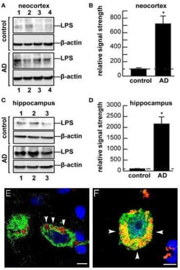 - Zhao, Y.; Cong, L.; Lukiw, W.J. Lipopolysaccharide (LPS) accumulates in neocortical neurons of Alzheimer’s disease (AD) brain and impairs transcription in human neuronal-glial primary co-cultures. Front. Aging Neurosci. 2017, 9, 407. [Google Scholar] [CrossRef]