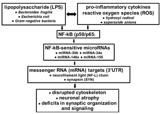 While commensal GI-tract microbes are beneficial and essential to human health, the enterotoxigenic forms of these same microorganisms have considerable potential to secrete highly neurotoxic biopolymers, including multiple varieties of Gram-negative bacterial-derived glycolipids such as LPSs, which are extremely potent inducers of pro-inflammatory and altered innate-immune and immunological signaling in infection, aging and diseases from AD to cancer [,,,,,,,,,,,,,,,,,,,,,,,,,,,,,,,,,]. One major characterized pathogenic role of LPSs appears to be the stimulation of cytokine-, chemokine- and/or ROS-mediated pathological signaling programs that drive the induction of pro-inflammatory transcription factor NF-kB (p50/p65), which subsequently promotes the transcriptional up-regulation of NF-kB-sensitive microRNAs. These, in turn, target AD- or related-disease-associated mRNAs, which ultimately down-regulate critically pathologically relevant gene expression programs, resulting in the initiation, development and/or propagation of human disease [,,,,,,,,,,,,,,,,]. For example, the LPS-mediated, ROS- and NF-kB-regulated up-regulation of microRNAs miRNA-30b, miRNA-146a and miRNA-155 in transgenic murine models of AD and in AD are now known to target and down-regulate the expression of important neuron-specific neurofilament and synaptic elements important in supporting and maintaining homeostasis in brain cells and neural signaling capabilities [,,,,,,] (Figure 2). An improved understanding of molecular–genetic signaling along the GI-tract-microbiome–CNS/PNS axis in healthy aging and in AD has significant potential for the development of new diagnostic, prognostic and therapeutic strategies and response-to-treatment efficacy monitoring for the more effective clinical management of AD and other types of progressive, age-related and ultimately lethal neurodegenerative disorders in which LPSs and other microbiome-derived neurotoxins appear to be involved.