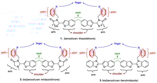 Some synthetic compounds with a dimeric and symmetric structure have been used as clinical drugs or drug candidates. These include brilacidin (an antibiotic and a COVID-19 drug candidate) [], cromolyn (anti-asthma and anti-inflammation) [], daclatasvir (an FDA-approved anti-HCV drug) [], ombitasvir (anti-HCV) [], pyrrolobenzodiazepine dimer (SJG-136, a phase 1 trial drug candidate for anti-tumor use) [], and suramin (an essential medicine on the WHO’s list to treat African sleeping sickness and river blindness). Similar to the structural characteristics of suramin, the design and synthesis of bis(benzofuran–thiazolidinone)s and bis(benzofuran–thiazinanone)s were published in 2017 []. These bis-heterocycles exhibit potency against chikungunya virus with a minimum EC50 of 1.9 μM and SI~75 or higher. Herein, we report two new series of dimeric compounds with the skeletons of bis(benzofuran–imidazolidinone) and bis(benzofuran–benzimidazole) as anti-YFV agents. Their design was on the basis of the scaffold of bis(benzofuran–1,3-thiazolidin-4-one) 1 as shown in Figure 1 []. Accordingly, these nitrogen-containing bis-conjugates 2 and 3 were synthesized, and their antiviral activities were explored.