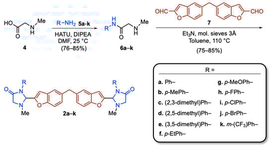 For construction of the imidazolidinone moiety in bis-conjugates 2a–k, N-methylglycine (4) was condensed with various substituted anilines 5a–k. Use of 1-[bis(dimethylamino)methylene]-1H-1,2,3-triazolo[4,5-b]pyridinium 3-oxide hexafluoro-phosphate (HATU) and N,N-diisopropylethylamine (DIPEA) as coupling reagents in DMF led to the best results []. The corresponding N-methyl amides 6a–k were obtained as solids in 76–85% yields. Then, condensation of 6a–k with bis-benzofuranal 7 [] was performed by use of molecular sieves in Et3N and toluene at 110 °C []. Finally, the desired conjugates 2a–k were produced as solids in good yields (75–87%) through dehydrative cyclization.