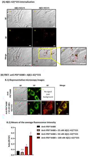 Internalization of Aβ(1-42)*555 after 2 h and 5 h incubation in living HT-22 cells and extensive FRET between anti-PDI and Aβ(1-42)*555 in fixed and permeabilized HT-22 cells. Panel (A): HT-22 cells were incubated with 2 μM Aβ(1-42) (1.8 μM of unlabelled Aβ(1-42) plus 0.2 μM of Aβ(1-42)*555) for 2 h and 5 h at 37 °C and 5% CO2. Figure 2A(a–c) shows representative images of bright field (BF), red fluorescence (RF), and Merge (BF plus RF) of HT-22 incubated for 2 h with Aβ(1-42). Figure 2A(d–f) shows representative images of BF, RF, and merge of HT-22 cells incubated for 5 h with Aβ(1-42). Figure 2A(g) shows a focalized zoom of Figure 2A(f) to highlight the subcellular distribution of Aβ(1-42)*555 near the perinuclear region of HT-22 soma. Scale bar inserted in fluorescence microscopy images = 20 μm. Panel (B): high co-localization between anti-PDI and Aβ(1-42)*555 as shown by the representative fluorescence microscopy images of HT-22 stained with anti-PDI/IgG-Alexa488 (PDI*A488, a–c) or with anti-PDI/IgG-Alexa488 plus 50 nM Aβ(1-42)*555 (PDI*A488/Aβ(1-42)*555, d–g) (B.1) and by the ratio of red/green fluorescence intensity per pixel (RF/GF) obtained from the analysis of fluorescence intensity data of HT-22 stained with anti-PDI/IgG-Alexa488 only (PDI*A488) and double stained with anti-PDI*IgG-Alexa488 plus 25, 50, or 100 nM Aβ(1-42)*555 (B.2). The results shown are the mean ± SEM (*) p < 0.05, (i.e., statistically significant relative to the control); n.s.—non-significant. Scale bar inserted in fluorescence microscopy images = 20 μm.