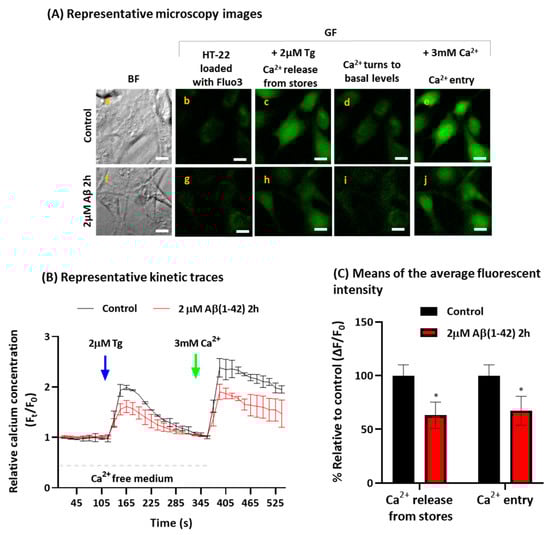 SOCE inhibition by Aβ(1-42) in HT-22 cells after 2 h of incubation. Untreated (control) and treated HT-22 cells incubated with 2 μM Aβ(1-42) for 2 h at 37 °C and 5% CO2 were loaded with 5 μM Fluo3-AM and 0.025% Pluronic® F-127 for 1 h to experimentally evaluate Ca2+ imaging of SOCE. Panel (A): representative microscopy images of Fluo3-loaded untreated HT-22 (control) and cells treated with 2 μM Aβ(1-42) 2 h, acquired during SOCE experiments. (a,f) Bright field images (BF) of the fields selected for fluorescence images of Fluo3-loaded cells obtained before addition of 2 μM Tg (b,g), at the peak fluorescence after the addition of Tg (c,h), after completion of the Ca2+ release from the ER (d,i), and at the peak fluorescence after the addition of 3 mM Ca2+ (e,j). Scale bar = 20 μm. Panel (B): representative kinetic traces of untreated HT-22 cells (black trace) and HT-22 cells incubated with 2 μM Aβ(1-42) for 2 h (red trace) after the addition of 2 μM Tg (indicated by the blue arrow) for Ca2+ release from stores and after addition of 3 mM Ca2+ to evaluate the extension of Ca2+ entry in HT-22 cells through the plasma membrane (indicated by the green arrow). Panel (C): means of the average fluorescent intensity (ΔF/F0) relatively to control, after addition of Tg (Ca2+ release from stores) or after addition of Ca2+ (Ca2+ entry). Results show that Aβ(1-42) inhibits 37 ± 7% and 32 ± 6% of Ca2+ release from stores and Ca2+ entry, respectively, compared with control. Data are presented as the mean ± SEM of experiments done at least in 10 Petri plates in 5 independent assays (n > 80 cells, * p < 0.05, relatively to each control).