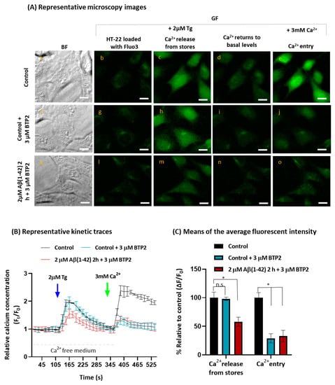 Effect of the SOCE inhibitor BTP2 in untreated (control) and treated HT-22 cells with Aβ(1-42). Untreated HT-22 cells (control) and treated cells with 2 μM Aβ(1-42) for 2 h were incubated with 3 μM of BTP2 for 15 min at 37 °C. Panel (A): representative fluorescence microscopy images of untreated HT-22 (control), cells with 3 μM BTP2, and cells treated with Aβ(1-42) plus 3 μM BTP2. (a,f,k) Bright field images (BF) of the fields selected for fluorescence images of Fluo3-loaded cells obtained before addition of 2 μM Tg (b,g,l), at the peak fluorescence after the addition of Tg (c,h,m), after completion of the Ca2+ release from the ER (d,i,n), and at the peak fluorescence after the addition of 3 mM Ca2+ (e,j,o). Scale bar = 20 μm. Panel (B): representative kinetic traces of HT-22 control with (blue trace line) or without BTP2 (black trace line) and HT-22 cells incubated with 2 μM Aβ(1-42) for 2 h plus BTP2 (red trace line) after addition of 2 μM Tg (indicated by the blue arrow) for Ca2+ release from stores, and addition of 3 mM Ca2+ to evaluate the extension of Ca2+ entry in HT-22 cells (indicated by the green arrow). Panel (C): means of the average fluorescent intensity (ΔF/F0) represented by percentage (%), relative to control cells. BTP2 does not elicit ER Ca2+ depletion but inhibits the Ca2+ influx in 71 ± 8% in control cells and HT-22 cells incubated with 2 μM Aβ(1-42) for 2 h, compared with the respective controls. Data are presented as the mean ± SEM of experiments done at least in 10 Petri plates in 5 independent assays (n > 80 cells for each condition) (* p < 0.05, relatively to each control). n.s.—non-significant.