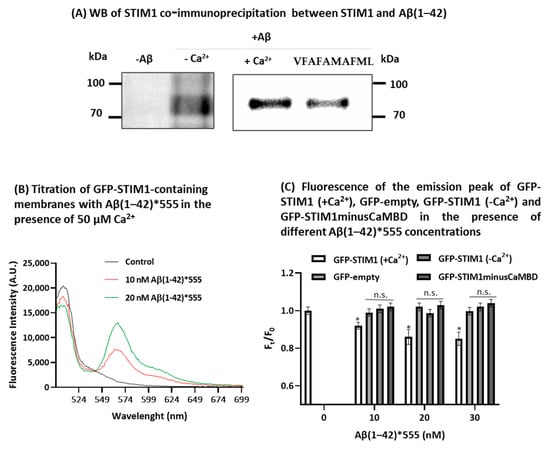 STIM1 is a target for Aβ(1-42). Panel (A): Western blots (WB) of STIM1 (anti-STIM1) after co-immunoprecipitation assay with mouse anti-Aβ antibody in the absence and presence of Ca2+, and in the presence of Ca2+ plus 1 μM of the peptide antagonist VFAFAMAFML, as described in the Materials and Methods section. Panel (B): titration of the fluorescence of STIM1-GFP in Ca2+ medium [STIM1-GFP (+Ca2+)] with different concentrations of Aβ(1-42)*555, using 10 μg/mL of HEK293 cell lysate containing STIM1-GFP in the absence (black trace) and after the addition of 10 nM (red trace) and 20 nM (green trace) of Aβ(1-42)*555. Fluorescence spectra were recorded at room temperature in buffer 50 mM N-[2-hydroxyethyl] piperazine-N′-[2-ethanesulfonic acid] (HEPES), 100 mM KCl, 2 mM MgCl2, and 50 μM CaCl2 (pH 7.05). The spectra were acquired between 20 and 30 min after the addition of the indicated Aβ(1-42)*555 concentration, with an excitation wavelength of 488 nm, and excitation and emission slits of 2 nm. Panel (C): fluorescence of the emission peak of STIM1-GFP(+Ca2+), GFP-empty, STIM1-GFP(-Ca2+), and STIM1-GFPminusCaMBD, in the presence of different Aβ(1-42)*555 concentrations. F and F0 are the fluorescence in the presence and the absence of Aβ(1-42)*555, respectively. The results shown are the means of triplicate experiments ± SEM (*) p < 0.05; n.s.—not statistically significant.