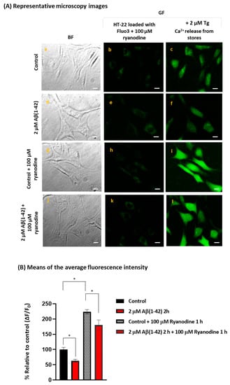 Aβ(1-42) partially stimulates RyR activity after 2 h of incubation in HT-22 cells. Untreated (control) and treated HT-22 cells with 2 μM Aβ(1-42) for 2 h were loaded with Fluo3-AM plus 0.025% Pluronic® F-127 in the absence and presence of the RyR inhibitor ryanodine (100 μM) for 1 h at 37 °C. Panel (A): representative microscopy images of untreated (control) and cells treated with Aβ(1-42) in the absence and presence of 100 µM ryanodine, before and after the addition of 2 µM Tg to the extracellular Ca2+-free medium for Ca2+ release from the stores. Bright field images (a,d,g,j) of the fluorescence images of Fluo3-loaded cells acquired before the addition of 2 μM Tg (b,e,h,k), and peak fluorescence images after de addition of Tg (c,f,i,l). Scale bar = 20 µm. Panel (B): means of the average peak fluorescence intensity per pixel after addition of 2 μM Tg to the extracellular Ca2+-free MLocke’s K5 medium in untreated cells (control) and HT-22 treated with 2 μM Aβ(1-42), in the absence and presence of 100 μM ryanodine. The results shown are the mean ± SEM. (*) p < 0.05. The results indicated that ryanodine blocks the RyR, as demonstrated by the significant increase in Ca2+ release from stores (2.2-fold) in control cells incubated with the inhibitor, compared with control cells without ryanodine. Additionally, there is a decrease in Ca2+ release from stores (±20%) in HT-22 cells treated with Aβ(1-42) plus 100 μM ryanodine, compared with cells incubated only with ryanodine (control plus ryanodine), indicating that Aβ(1-42) partially stimulates the RyR activity.