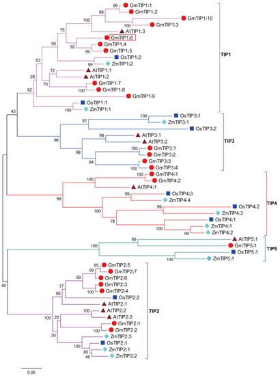 Phylogenetic relationship of GmTIP1;6 from soybean, Arabidopsis, rice and maize TIPs. TIPs were divided into five groups (TIP1, TIP2, TIP3, TIP4, and TIP5), which were marked with different colors. Soybean TIPs (GmTIPs), Arabidopsis TIPs (AtTIPs), rice TIPs (OsTIPs), and maize TIPs (ZmTIPs) were marked with red spots, purple triangles, dark blue squares, and light blue diamonds, respectively. GmTIP1;6 was marked with the red box.