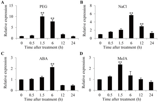 Expression patterns of GmTIP1;6 under drought, salt, ABA, and MeJA stress treatments in vegetable soybean seedlings. Vegetable soybean seedlings were treated with 20% PEG6000 (A), 250 mM NaCl (B), 100 µM ABA (C), and 100 µM MeJA (D). ** indicated significant differences in comparison with the control treatment at p < 0.01 (t-test).