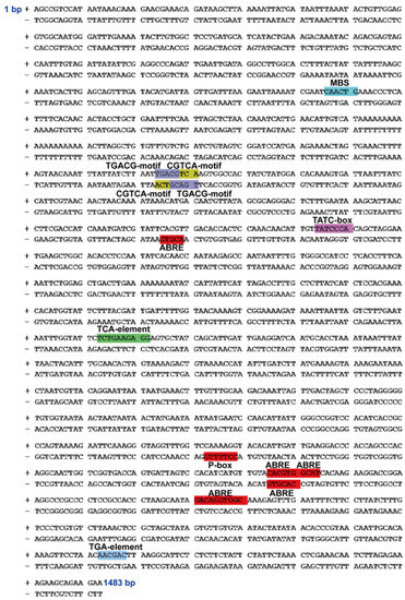 - Lescot, M.; Déhais, P.; Thijs, G.; Marchal, K.; Moreau, Y.; Van de Peer, Y.; Rouzé, P.; Rombauts, S. PlantCARE, a database of plant cis-acting regulatory elements and a portal to tools for in silico analysis of promoter sequences. Nucleic Acids Res. 2002, 30, 325–327. [Google Scholar] [CrossRef] [PubMed]