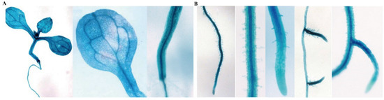 GUS staining and activity detection were conducted as described previously [19,30,31]. The seedlings of transgenic Arabidopsis after staining were photographed using the Leica microscope. GUS activities were analyzed and compared based on Student’s t-test, at a significant level of p < 0.01.