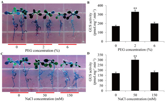 To explore the roles of the GmTIP1;6 promoter in response to drought and salt stresses, transgenic Arabidopsis seedlings were subjected to 2–6% PEG6000 or 50–150 mM NaCl, and GUS activities were compared. After PEG treatment, GUS staining was sharply enhanced (Figure 5A). Stronger GUS activity was detected under 2% PEG6000 than that under 6% PEG6000 (Figure 5B). Similarly, after NaCl treatment, GUS staining was remarkably induced (Figure 5C). GUS activity under 50 mM NaCl was higher than that under 150 mM NaCl (Figure 5D). The result confirmed that the activities of the GmTIP1;6 promoter could be elevated by drought and salt stresses.