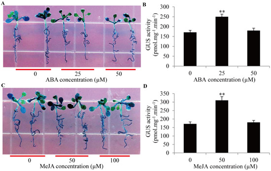 To investigate the roles of the GmTIP1;6 promoter in response to ABA and MeJA signals, transgenic seedlings were treated with 25–50 µM ABA or 50–100 µM MeJA, and GUS activities were contrasted. ABA and MeJA treatments highly promoted the GUS activity (Figure 6A,C). GUS activity after a 25 µM ABA treatment exhibited a greater increase than that after a 50 µM ABA treatment (Figure 6B). Similarly, GUS activity after a 50 µM MeJA treatment displayed more abundance than that after a 100 µM MeJA treatment (Figure 6D). The result verified that the activities of the GmTIP1;6 promoter could be enhanced by ABA and MeJA signals.