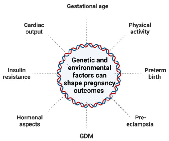Pregnancy-related risk factors can influence maternal DNA methylation patterns, potentially increasing clinical risk and rendering mothers susceptible to long-term consequences. There is an increasing need to investigate the genetic and epigenetic factors such as DNAm from obstructive maternal tissues such as whole blood, which can help monitor fetal–maternal conditions during pregnancy. During pregnancy and postpartum, the epigenetic profiling of peripheral blood DNA from pregnant women may improve insight into the physiological alterations that occur. This can help us to recognize potential biomarkers for pregnancy outcomes. Environmental factors and genetic factors have also been assessed regarding their association with each cell type or tissue. Epigenetic differences are regulated in a tissue- and developmental stage-specific manner. Due to the massive between-tissue differences in DNA methylation patterns, it is a considerable challenge to identify instructive epigenetic signatures in blood or placenta epigenomes and then prove that they cause, at least to some extent, methylation variation in the target tissues [26]. A study that was conducted in maternal white blood cells shows changes in the methylation profile of the LINE-1 elements, which are extremely methylated in normal conditions but are hypo-methylated during stress [27]. Hyper-methylation of LINE-1 elements in early stages of pregnancy can lead to preterm birth [21]. In other words, dynamic DNAm changes modulate the differential expression of the genome in variable maternal tissues such as the uterus and breasts, and respond to environmental factors from the nulligravid to postpartum state [28]. Several environmental and genetic factors are presented in Figure 2.