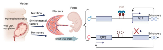 It is becoming increasingly clear that proper epigenetic regulation is a significant mediator of placental development and function, although the specific role of epigenetic factors in the pathogenesis of hypertension-linked placental dysfunction remains incompletely understood. Epigenetic mechanisms support placental functional adaptation by altering environmental conditions. The most robust evidence regarding the impact of epigenetic factors during pregnancy is derived from early studies exploring human embryonic and placental methylomes, revealing that the placenta maintains a globally hypo-methylated DNA profile throughout pregnancy, with such hypo-methylation typically occurring in large domains known as partially methylated domains (PMDs) that cover almost 40% of the placental genome [44]. Epigenetic changes in the placenta may provide an effective mechanism that links environmental stressors to adverse pregnancy outcomes, particularly in the context of fetal malformations. Epigenetic changes have been demonstrated within placental tissues, including altered DNA methylation patterns, changes in the binding activity of DNA-binding proteins (DBPs), imprinted regions in the H19/IGF2 genes, and shifts in the methylation of histones associated with the human growth hormone gene in placental chromatin [45]. In particular, imprinted genes in mammals are unevenly expressed from the two parental alleles. This is the case of the H19/IGF2 locus, which consists of the maternally expressed H19 non-coding RNA and the paternally expressed IGF2. The epigenetic regulation of the H19/IGF2 gene-cluster relies on a shared set of enhancers located downstream of the H19 gene. On the maternal chromosome, H19 gene expression is driven by this set of regulatory enhancers, whereas on the paternal chromosome, the enhancers are used by IGF2 (Figure 4). Further investigations are ongoing to more fully clarify the epigenomic modulation of pregnancy-related pathology, with a particular focus on the epigenetic profiles of placental resident immune cells, which are primarily responsible for the safe onset and progression of pregnancy.