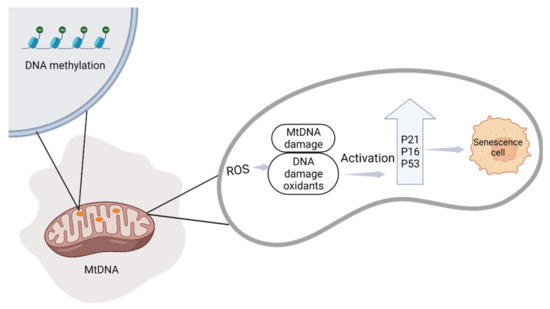 Mitochondrial dysfunction caused by DNA methylation is a potential trigger for mtDNA depletion. ROS production induces translocation of the p53, p16, and p21 proteins to the mitochondria, and activates senescence markers.