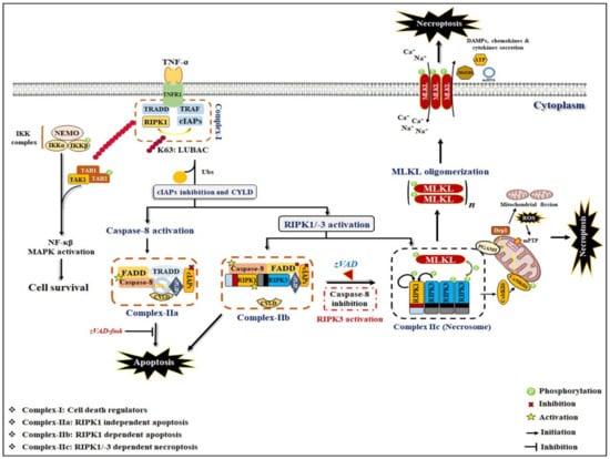 Among the wide range of stimuli, TNF-α/TNFR1-stimulated necroptosis is the most common and well-understood signaling mechanism [23]. TNF-α is a key pro-inflammatory cytokine that is known to be associated with multiple inflammatory diseases, including cancer. Following the binding of TNF-α with TNFR1, subsequently, receptor trimerization leads to the requirement of multiple proteins, namely RIPK1, TNFR-associated death domain (TRADD), TNFR-associated factor 2 (TRAF2), TRAF5, and cellular inhibitor of apoptosis 1 (cIAP1), cIAP2, and linear ubiquitin chain assembly complex (LUBAC) toward the intracellular domains of TNFR1, which leads to rapid formation of membrane-associated complex I [35]. In this complex, TRADD functions as an adaptor molecule for the recruitment of RIPK1 to TNFR1. The linear and Lysine-63-linked ubiquitinylation of RIPK1 intermediate domains (ID) are mediated by LUBAC and cIAP1/2, respectively [36]. This poly-ubiquitinylation of RIPK1-ID further recruits and activates the transforming growth factor-activated kinase complex (TAK1 and TAK1-binding protein (TAB) 1/2) and the inhibitor of the NF-κB kinase (IKK) complex (consisting of NF-κB essential modulator (NEMO), IKKα and IKKβ) [37,38]. Afterward, both IKK and TAK complexes lead to activation of pro-survival NF-κB and MAPKinases signaling pathways [23], which further transactivate cytoprotective genes, such as cellular FLICE-like protein (cFLIP), and stimulate cell survival [36]. Hence, complex I is an essential checkpoint for cell survival and necroptosis. Furthermore, phosphorylation of RIPK1 at Ser25 by IKKα/β directly inhibits RIPK1 kinase activity and prevents the assembly of the death-inducing signaling complex (DISC), also known as complex-II [39,40].