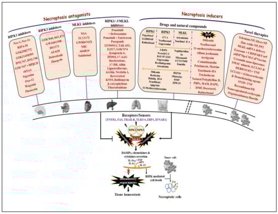 In the past decades, much research has been conducted since the discovery of the first necroptosis inhibitor Nec-1, a specific target of RIPK1 [9,193]. Understanding necroptotic signaling has been growing, which is accompanied by findings of novel classes of necroptosis-targeting compounds. As necroptosis is not only involved in the maintenance of organismal homeostasis, but also forms etiological determinants of many human pathologies, at least two therapeutic models may be proposed: (i) activation of necroptosis to bypass accrued apoptosis- and drug-resistance in most cancer cells; (ii) inhibition of necroptosis to limit the loss of post-mitotic cells in inflammatory, toxic syndrome, and I/R injury-mediated pathologies. In this part, we reviewed a panel of a novel class of drugs that specifically targets necroptosis either via modulating expression or the activity of direct/indirect mediators of necroptosis. Some of them were successfully tested in preclinical and clinical trials (Figure 5).