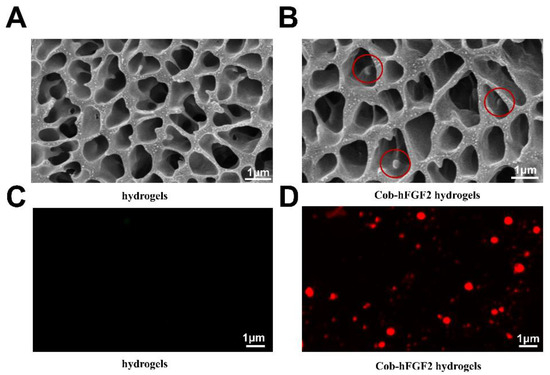 Characterization of CLD-hFGF2 hydrogels. Microstructure of the blank hydrogels (A) and CLD-hFGF2 hydrogels (B) observed using Cryo-SEM (red circle represents CLD-hFGF2). Fluorescence image of blank hydrogels (C) and CLD-hFGF2 hydrogels (D) (scale bar = 1 μm, n = 3).