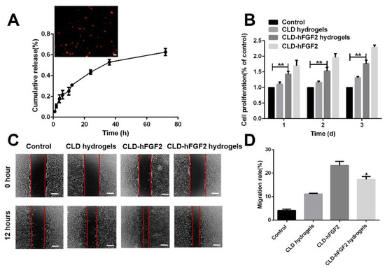 Cell proliferation and migration activity of CLD-hFGF2 released by hydrogels. (A) The CLD-hFGF2 release profiles from the hydrogels and the shape of the released CLD-hFGF2. (B) Fibroblast cell proliferation ability under PBS treatment. CLD was released from hydrogels, and CLD-hFGF2 and CLD-hFGF2 were released from hydrogels. (C) Fibroblast cell migration ability and rate of cell migration under PBS, CLD released from hydrogels, CLD-hFGF2, CLD-hFGF2 released from hydrogels. (D) Rate of cell migration under PBS, CLD released from hydrogels, CLD-hFGF2, CLD-hFGF2 released from hydrogels (n = 3; ** p < 0.01; scale bar = 50 μm).