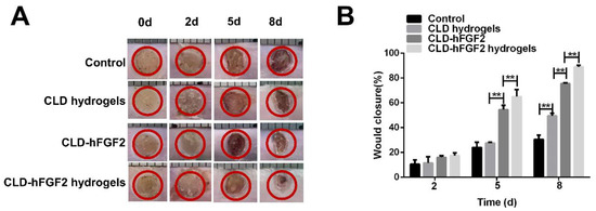 CLD-hFGF2 hydrogels accelerate deep second-degree burn wound healing. (A) Images of skin wounds after being covered with PBS, CLD hydrogels, CLD-hFGF2, and CLD-hFGF2 hydrogels. (B) Wound healing rates on the 0th, 2nd, 5th, and 8th days (n = 6, ** p < 0.01).