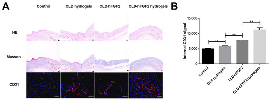 Granulation tissue, collagen, and expression of CD31 for different groups on the wound healing on the 8th day. (A) Images of HE, Masson and CD31 after covering with PBS, CLD hydrogel, CLD-hFGF2 and CLD-hFGF2 hydrogel. (B) Visualization of data on CD31 signals. (n = 4, ** p < 0.01) (HE and Masson staining are shown at 4 × 10 magnification, scale bar = 50 μm; CD31 staining is shown at 40 × 10 magnification, scale bar = 50 μm).