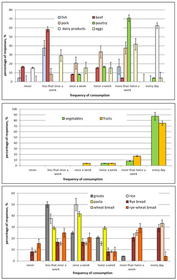 Permission for the study was obtained from the Bioethics Commission at the Regional Chamber of Physicians and Dentists (Bioethics Commission permission no. OIL-Sz/MF/KB/452/02/04/2015, 23 April 2015). Based on our own experience, information from hospitals, and literature data, we developed our own 2-part questionnaire. The questionnaire collected information on the characteristics of the mothers participating in the study; the eating habits of the mothers during pregnancy, taking into account the frequency of the consumption of certain food products; and data on smoking (Table 1). The questionnaire also included information about the child. Before starting the research, mothers provided their written consent to participate in the experiment, i.e., to transfer samples of their own milk to the laboratory during particular periods of lactation and to fill in the questionnaire. The nutritional habits of the mothers participating in the study as reported on the questionnaire are presented in Figure 1. All participants provided the required information. None of the participants reported on the questionnaire that they had had previous contact with hazardous chemicals, inter alia, at their places of employment or residence.