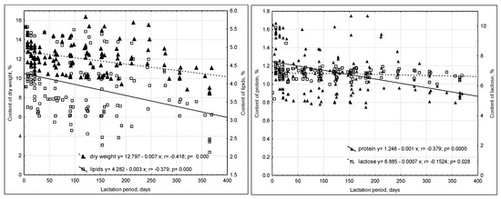 Weak negative correlations were noted between the stages at which milk was collected and its lactose content (r = −0.15) (Figure 2).