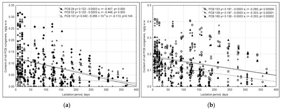 Weak average negative correlations (p < 0.05) were noted between the content of individual ndl-PCB congeners and the duration of lactation, with correlation coefficient r values ranging from −0.448 for PCB 52 to −0.280 for PCB 153. No such relationship was noted for PCB 101 (Figure 3).
