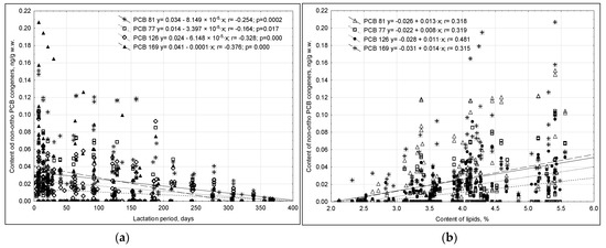 A weak average positive correlation (r = 0.202–0.481) was confirmed between milk lipid contents and non-ortho PCB residues, which proved not only the lipophilic nature of these compounds, but also the influence of other factors that can affect their presence in human milk (Figure 4b).