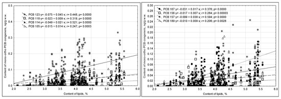 Positive relationships were also noted between the content of mono-ortho PCB congeners and milk lipid content (r = 0.20–0.59) (Figure 6).