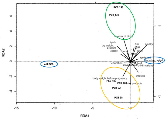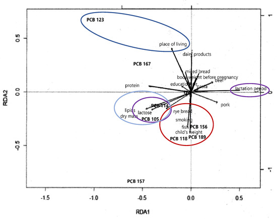 RDA analysis (Figure 9) confirmed positive correlations between the concentrations of PCB congeners 123 and 167 and women’s residence in cities with populations greater than 5000.