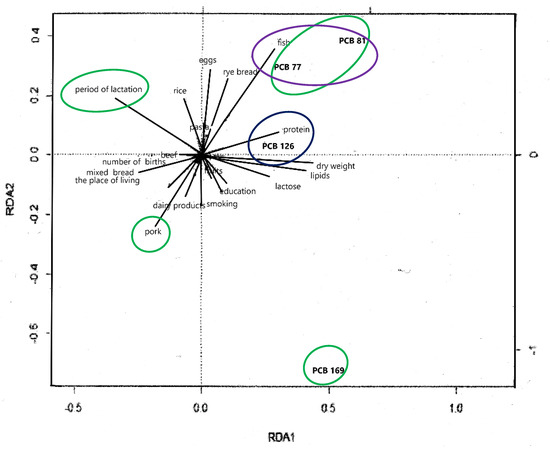 The contents of both PCB 77 and PCB 81 in milk was strongly positively correlated with the quantities of fish consumed, while the concentrations of these compounds decreased with the frequency of pork and dairy product consumption. RDA analysis also showed a positive correlation between the content of PCB 126 residues and the protein content of milk. The frequency of the consumption of wheat-rye bread negatively correlated with PCB 126 content (Figure 8).