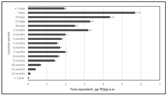 The dl-PCB content expressed as the toxic equivalent (TEQ) was within the range of 0.033–5.676 pg-TEQ/g w.w. Assuming that “foods for infants and young children” [24] also includes human milk, the maximum levels permitted for dl-PCBs were exceeded. When the different lactation stages were considered, the maximum levels were not exceeded only in milk collected after one year of breastfeeding (Figure 10).