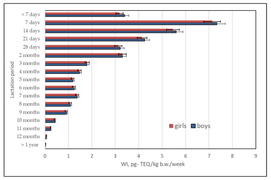 Considering these data, the weekly intake of dl-PCBs in human milk was 0.021–7.33 pg-TEQ/kg bw/day, with an average intake of 2.13 pg-TEQ/kg bw/week for female infants and 2.18 pg-TEQ/kg bw/week for male infants (Figure 11).