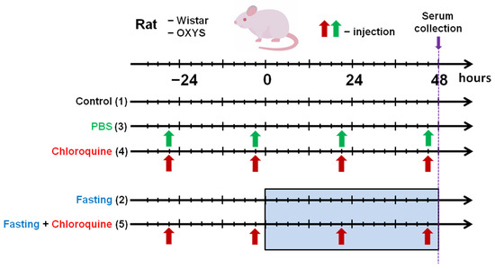 OXYS and Wistar rats of the age of 4 months were randomly distributed into treatment and control groups. Autophagy was induced by fasting the animals for 48 h, and autophagy inhibition was performed with the drug chloroquine (CQ) diluted in 0.01 M phosphate-buffered saline (PBS) by intraperitoneal injection to animals for 4 days before euthanasia (50 mg/kg, with the last injection administered 3 h before euthanasia). Two control groups were used: intact control and vehicle PBS-injected rats, which served as a control for the CQ treatment groups. The rats were euthanized by CO2 asphyxiation and decapitated. Blood samples were collected by decapitation and kept at room temperature for 15 min, centrifuged at 3000 rpm for 15 min. Blood serum was collected from animals of the following five experimental groups (Figure 1): (1) control, intact rats, (2) rats fasting for 48 h, (3) PBS, vehicle control, (4) CQ, four daily intraperitoneal injections by 50 mg/kg, (5) combined effects of 48 h fasting during CQ treatment, four daily intraperitoneal injections by 50 mg/kg. Each group consisted of 6 samples for both strains of rats, except the OXYS fasting group which consisted of 5 rats. The collected serum samples were stored at −70 °C until analyzed.