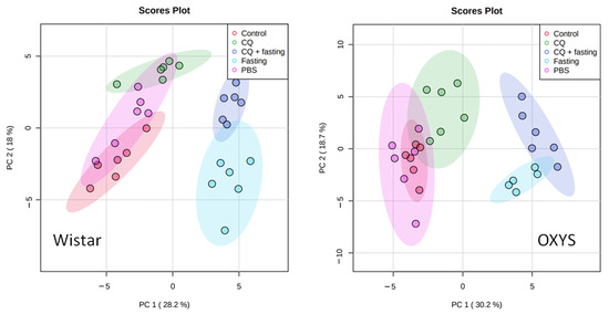 Pairwise comparison of the metabolomic profiles of the following groups was carried out using PCA analysis: control groups, groups with autophagy induction by fasting, groups with autophagy inhibition by CQ, and combined effects of fasting and CQ depending on the genotype of animals (Figure S4). According to PCA analysis, the serum metabolomes of Wistar and OXYS rats after exposure to CQ were similar: there was a large overlap in the distribution areas of the samples. For groups of control, fasting, and combined exposure, there was a partial overlap of distribution areas, indicating that the basic metabolomic profiles of Wistar and OXYS rats and their reactivity in response to fasting differ.