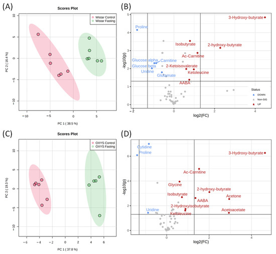 Figure 3. PCA score plots and Volcano plots of blood metabolites of Wistar (A,B) and OXYS (C,D) rat strains for fasting and control groups. In Volcano plots, the horizontal line depicts a cut-off of FDR-adjusted p-value = 0.05; metabolites with fold change threshold (fasting vs. control) = 1.5 are highlighted.